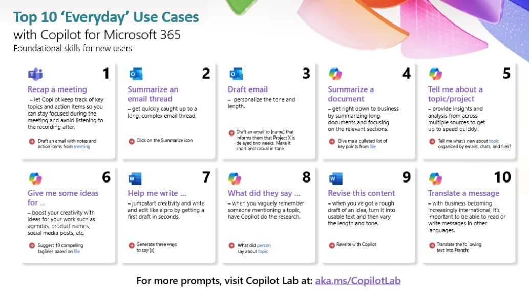 Check out the learning resources below, and in less than 30 minutes, you can learn the fundamentals of M365 Copilot and will be up and on your way!